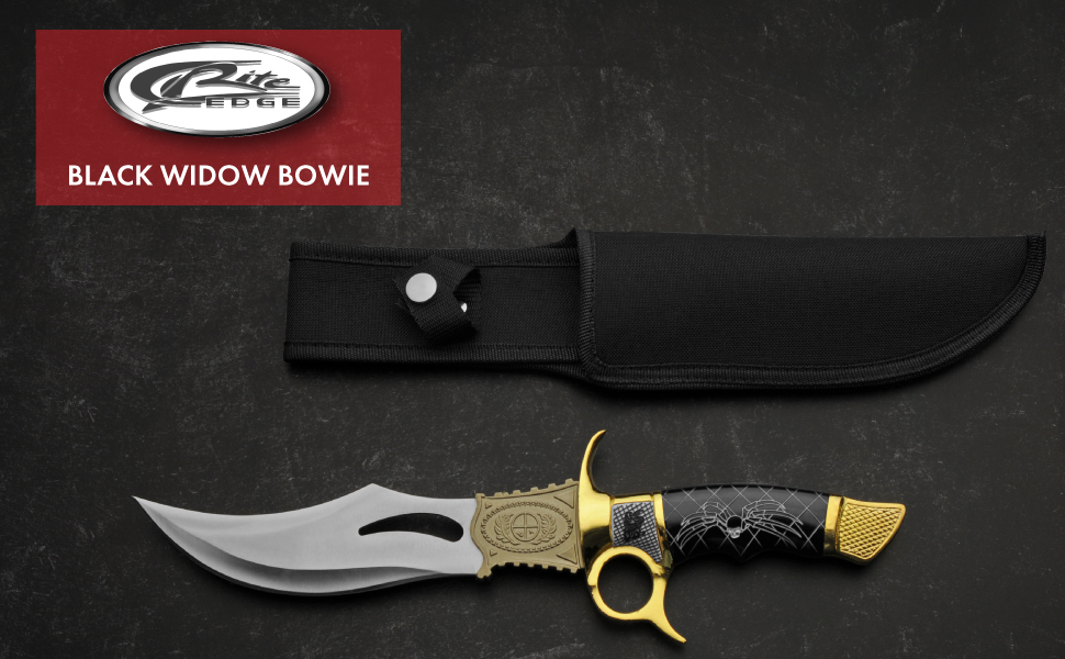 The 14” Black Widow Bowie Knife is a perfect blend of functionality and aesthetic appeal. Featuring an 8-inch stainless steel clip-point blade, this Bowie knife offers precision and durability, making it an ideal choice for outdoor activities like camping, hunting, and tactical applications. Known for its versatility, this fixed blade self-defense knife is an excellent option among fixed blade hunting knives and survival knives. The handle is designed with a black widow spider-inspired motif, complete with golden accents on the pommel and guard, providing a secure grip. The high-friction ridged surface and finger loop ensure a firm hold, making it perfect as a hunting knife or knife for self-defense. This is a great hunting knife for men, suitable for any outdoor enthusiast or collector. This decorative yet practical knife is a standout addition to any knife collection, whether for display or everyday use. It comes with a durable nylon sheath, making it an ideal knife with sheath for safe storage and portability. The Bowie knife with sheath offers both practicality and aesthetic appeal. Whether you’re an avid outdoorsman, a collector, or someone in need of hunting knives for men, this fixed blade hunting knife delivers both style and substance. It’s perfect for tackling tough outdoor tasks, hunting, or serving as a reliable tool for self-defense.