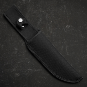 Secure Grip & Functionality: Textured black polymer handle with a finger loop for a no-slip grip, golden-plated pommel and guard for durability, and a reinforced nylon hunting knife with sheath for safe carrying and storage.