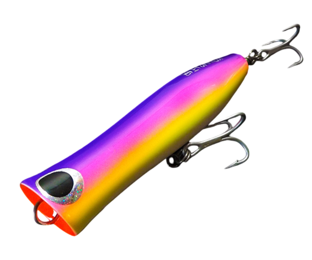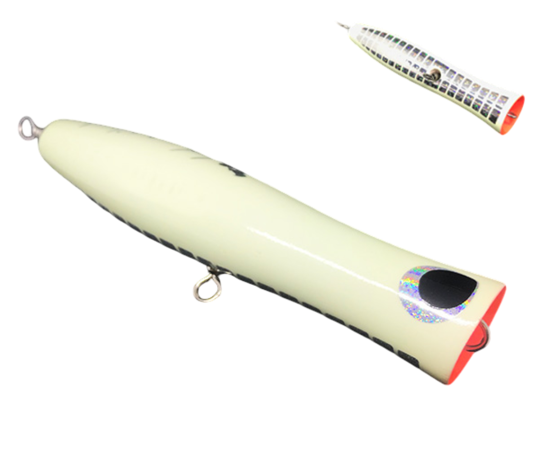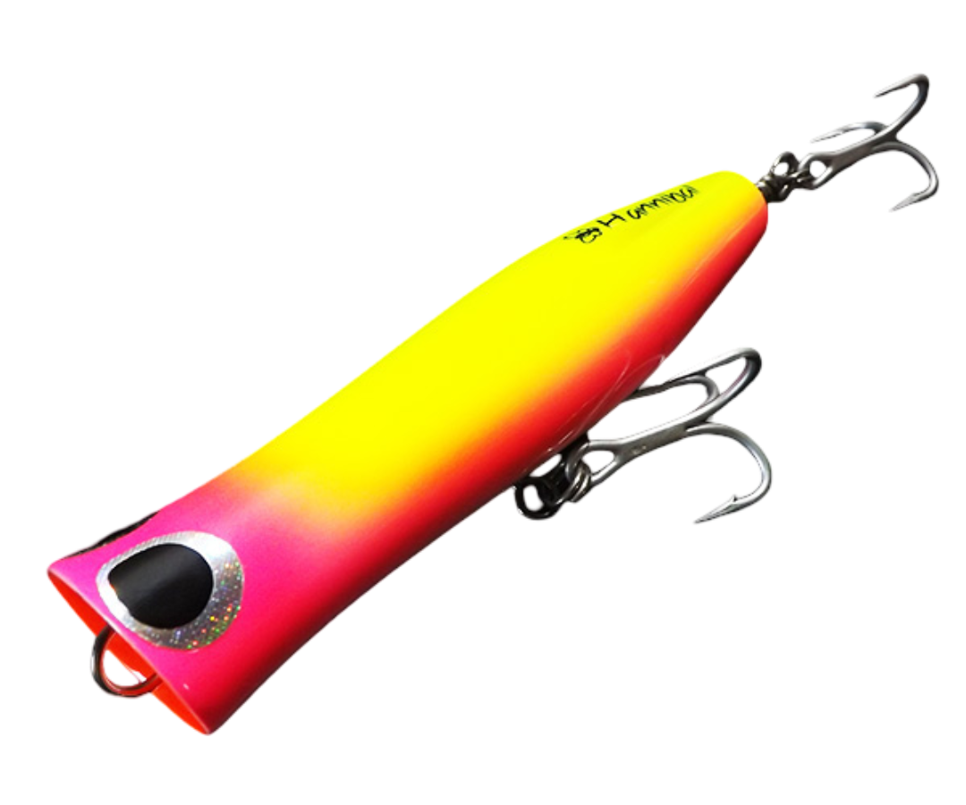 The Hannibal 45gr Lure is a popper made of high quality wood for fishing in salty and fresh water. The floating ability and design makes this popper swim very fast and explosive.  Great for catching peacock bass, tunas,  yellowtail etc.