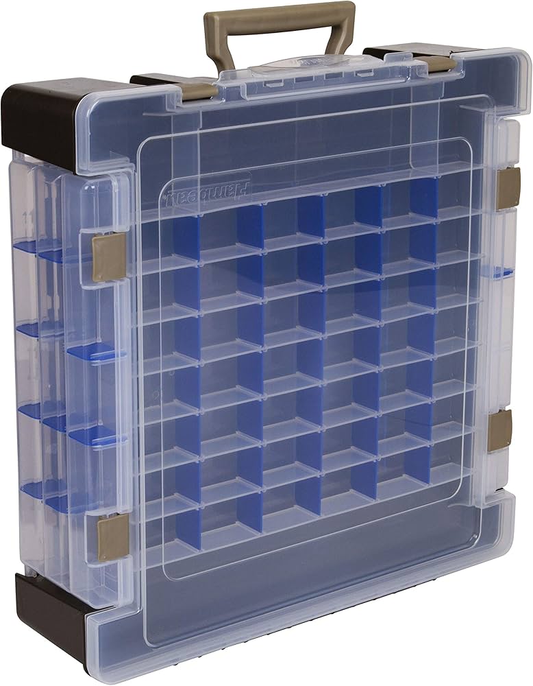 The Super Max Satchel will send you on a buying spree to fill this multipurpose satchel full of your favorite fishing accessories. Features a total of 118 tackle storage compartments! Deep base has (8) fixed compartments and (9) removable Zerust dividers for large tackle storage needs. Flip down side storage features (3) fixed compartments with (9) Zerust dividers. Top lid has (11) fixed compartments and (20) Zerust dividers to house your smaller tackle and accessories. The ideal boat, bank or pier tackle management system.