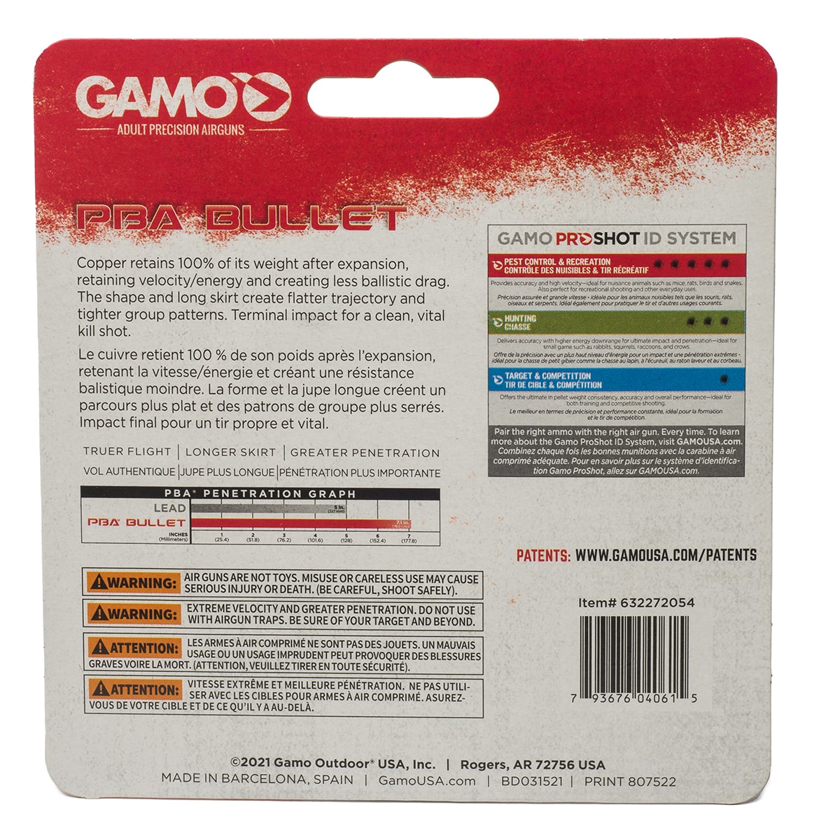 The Gamo PBA Bullet is of Copper and retains 100% of its weight after expansion, retaining velocity/energy and creating less ballistic drag. The shape and long skirt create flatter trajectory and tighter group patterns. Terminal impact for a clean, vital kill shot.